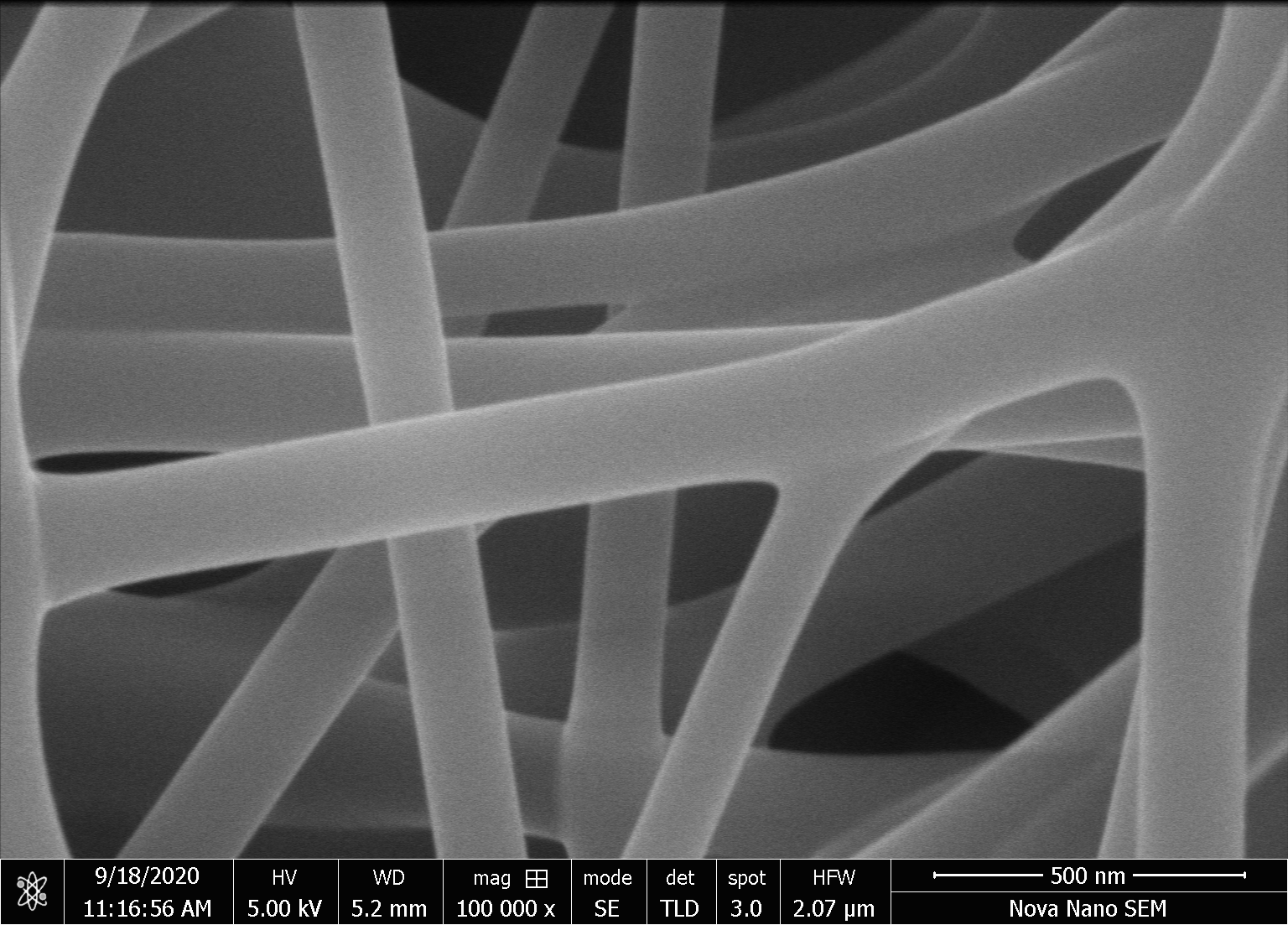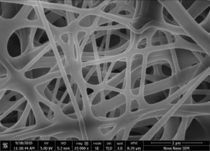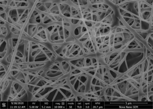 To synthesize fibers or spraying the substrate with the polymeric material, a syringe, filled with the required material, is installed in the syringe pump. The properties of this solution such as viscosity, concentration are chosen by the researcher. The metallic needle of the syringe is connected with the high voltage connection and the target sample is placed on the hot plate. After adjusting the voltage and temperature on the front panel of the controller, the pumping and stage movement parameters are set on the computer screen. A “begin coating” button on the UI then starts the automatic fiber generation or electrospraying process.